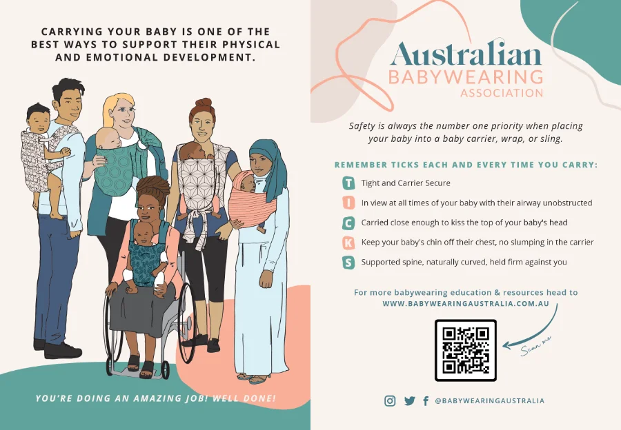 You are welcome to download and share these materials freely for educational and awareness purposes. Please keep the safety messages intact and include credit to Babywearing Australia where shown.